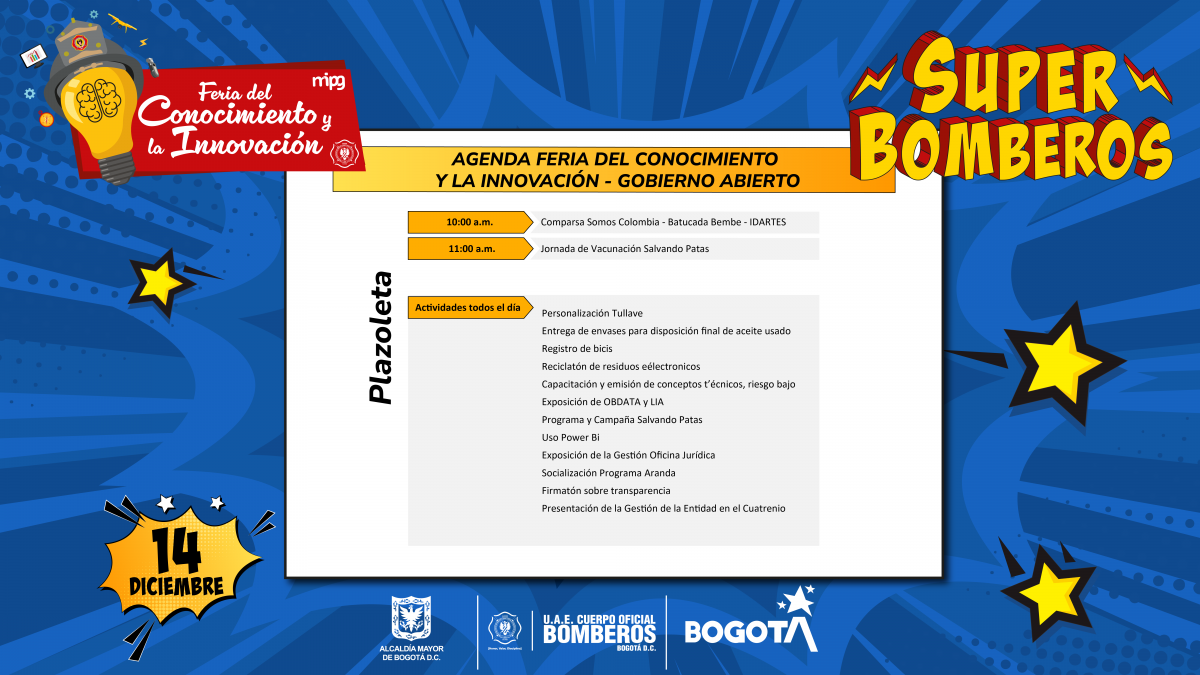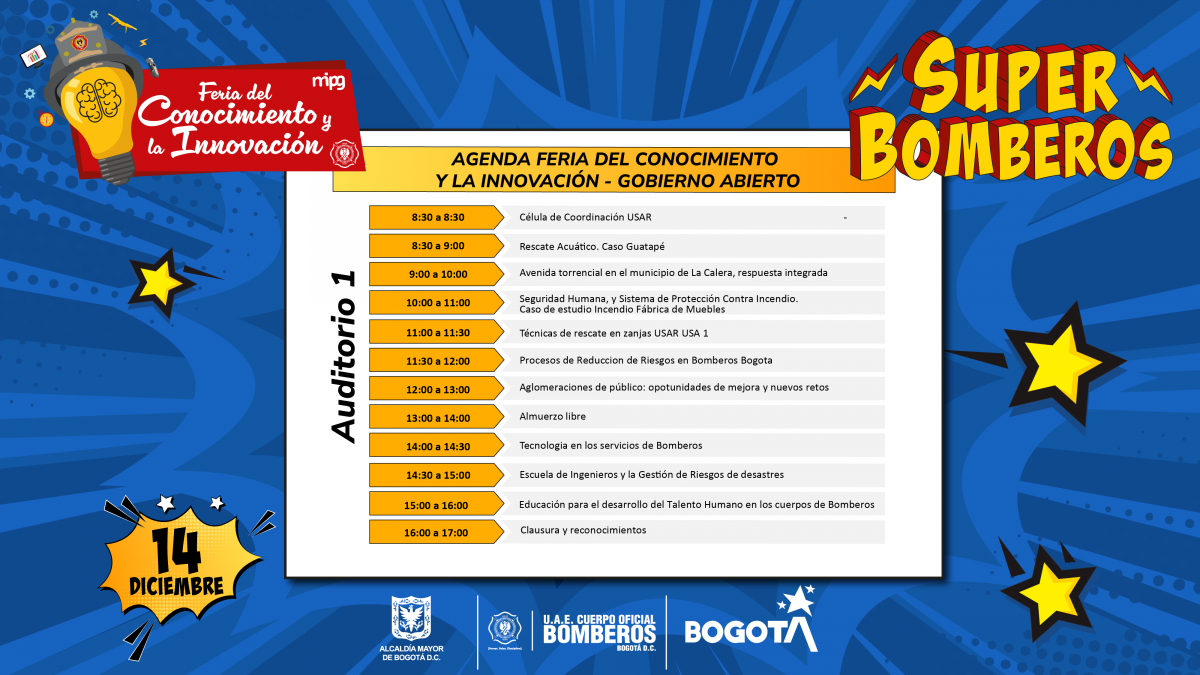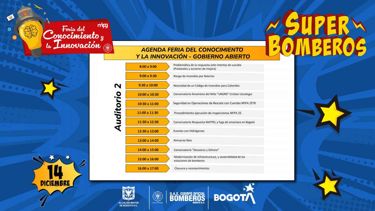 La Feria del Conocimiento y la Innovación, a realizarse durante los días 13 y 14 de diciembre de 2023, tiene un espacio abierto para quienes quieran aprende más sobre el conocimiento técnico del Cuerpo Oficial de Bomberos de Bogotá, y el Gobierno Abierto.